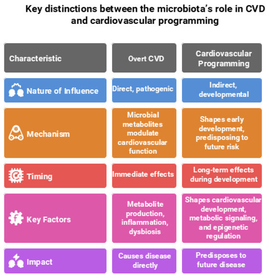 In contrast, during cardiovascular programming—which encompasses long-term alterations in cardiovascular structure and function originating from early-life exposures—the gut microbiota plays a more indirect, developmental role. At this stage, the microbiota does not directly cause disease but instead shapes cardiovascular development, metabolic signaling, and epigenetic regulation during critical windows of growth. These early-life microbial influences establish physiological trajectories that predispose individuals to increased cardiovascular risk later in life [10,15]. Understanding these divergent roles is crucial for developing targeted interventions—whether for managing overt CVD or preventing cardiovascular disease through early-life microbiome modulation. Key distinctions between the microbiota’s role in CVD and cardiovascular programming are illustrated in Figure 1 and elaborated upon in the following sections.
