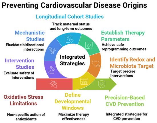 Moreover, excessive antioxidant exposure may paradoxically induce “antioxidant stress”, disrupting redox homeostasis, and potentially contributing to adverse developmental outcomes [234]. While antioxidant interventions are biologically plausible as reprogramming agents, excessive or indiscriminate use—particularly at higher doses of vitamins and micronutrients—may disrupt physiological redox signaling, interfere with inflammatory and immune networks, and pose risks to both mother and fetus. Clinical trials have yielded inconsistent results, possibly due to suboptimal timing, limited bioavailability, or failure to target oxidative pathways most relevant to developmental programming. The optimal dose, timing, and therapeutic window for antioxidant-based reprogramming remain undefined, and comprehensive clinical and experimental studies elucidating the mechanisms linking early-life antioxidant exposure to adult cardiovascular outcomes are lacking. Future research should identify precise developmental windows (e.g., prenatal vs. pre-weaning), delineate organ-specific redox-sensitive pathways involved in cardiovascular programming, and match antioxidant strategies to the right dose and timing for safe and effective outcomes. These efforts should be coupled with longitudinal birth cohort studies integrated with mechanistic experimentation and multi-omics approaches to disentangle the interplay between microbiota-derived metabolites, redox balance, and cardiovascular phenotypes.