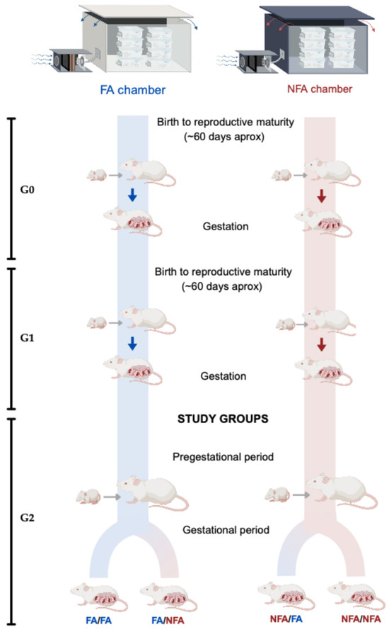 Following mating, the G2 females were allocated into four experimental groups: FA/FA (control group; animals reared and completing gestation in a chamber equipped with an air filter), FA/NFA (animals reared in a filtered-air chamber but completing gestation in an unfiltered chamber), NFA/FA (animals reared in an unfiltered chamber but completing gestation in a filtered chamber), and NFA/NFA (animals reared and completing gestation in an unfiltered chamber). All G2 females selected for the study had experienced at least one estrous cycle prior to mating (Figure 1).