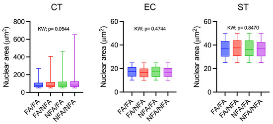 Analysis of the nuclear area of cytotrophoblasts (CTs), endothelial cells (ECs), and syncytiotrophoblasts (STs) in the labyrinth zone of the rat placenta at 21 days post-fertilization (dpf) following exposure to wood smoke-derived PM2.5 (n = 12 animals per group).