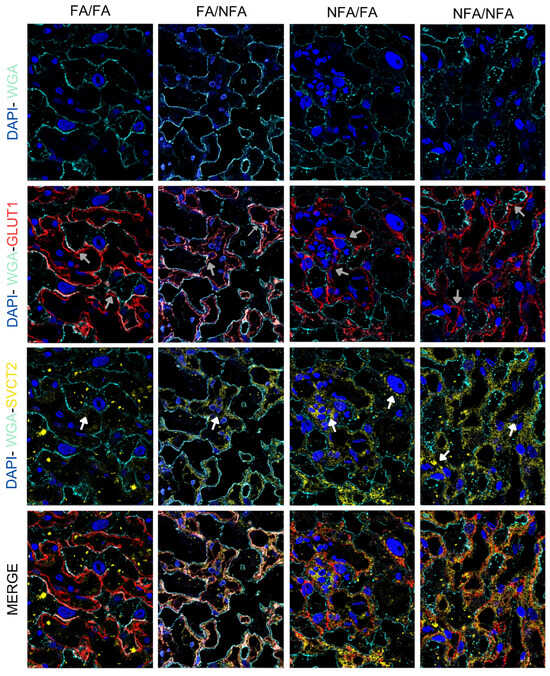 Representative confocal immunofluorescence images in placental labyrinth zone in 21-day post-fertilization (21-dpf) Sprague–Dawley rats (n = 12 animals per group). The panel shows DAPI (nuclei, blue), wheat germ agglutinin (WGA, cell membranes, light blue; white arrow), SVCT2 (yellow), and GLUT1 (red) staining, with the merged images demonstrating colocalization. Experimental groups are labeled as FA/FA, FA/NFA, NFA/FA, and NFA/NFA. In the FA/FA (control) group, intense and uniform colocalization between SVCT2 (yellow) and GLUT1 (red; gray arrow) was observed on the cell membranes delineated with WGA (light blue), along with well-defined nuclei labeled with DAPI (blue). The WGA marker clearly outlined the cell membranes, and the SVCT2 and GLUT1 signals appeared organized and overlapped across multiple membranous regions. In the FA/NFA group, SVCT2 and GLUT1 colocalization was less intense than in the FA/FA group. The WGA signal enabled the visualization of recognizable cell membranes, with regular morphology and defined contours. SVCT2 and GLUT1 distribution was visible, although with less overlap than in the control group. In the NFA/FA group, SVCT2 signal showed a more heterogeneous and more intense distribution compared to FA/FA, while GLUT1 exhibited localized expression. The WGA pattern remained defined, although regions with discontinuity in the cell contours were identified. In the NFA/NFA group, the signal intensity of SVCT2 and GLUT1 was increased, and their localization displayed a higher degree of heterogeneity. WGA staining was less intense and more fragmented, with a loss of clarity in cell boundary definition (magnification: 40×).