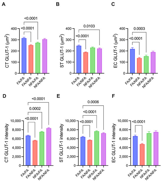 Expression of the GLUT1 transporter in different cell types of the placenta in 21-day post-fertilization (21-dpf) Sprague–Dawley rats (n = 12 animals per group; mean ± SEM). The expression is shown in three cell types: cytotrophoblast (CT), syncytiotrophoblast (ST), and endothelial cells (ECs). Panels (A–C) corresponding to the area (µm2) in CT, ST, and EC, respectively, and panels (D–F) corresponding to the fluorescence intensity in CT, ST, and EC, respectively, under different experimental conditions (Kruskal–Wallis; p < 0.05).