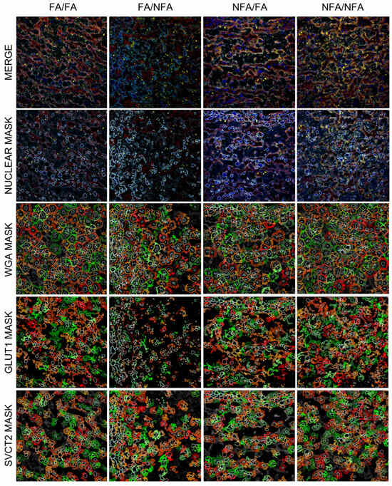 Subcellular localization of WGA and the transporters SVCT2 and GLUT1 in the placenta of pregnant rats (n = 12 animals per group) at 21 days post-fertilization (dpf), analyzed using masks generated with StrataQuest 7.1.1.138 software to delineate the subcellular expression of the markers. A total of 21 fields of view (FOVs) per experimental group (FA/FA, FA/NFA, NFA/FA, NFA/NFA), each digitized at 40× magnification with an individual surface area of 0.125491 mm2, were analyzed using the Cell Analysis and Classification module. Exclusive gestational exposure was associated with reduced colocalization of GLUT1 with WGA, showing decreased expression and predominantly cytoplasmic localization. In contrast, pregestational exposure was associated with SVCT2 internalization, with expression observed both on the plasma membrane and in the cytoplasm. Mask details: nuclear mask delineates the cell nucleus; WGA mask marks the plasma membrane; GLUT1–SVCT2 mask shows the subcellular distribution of the transporters. Colors in the masks vary to distinguish cells and are randomly assigned by the software (magnification: 40×).