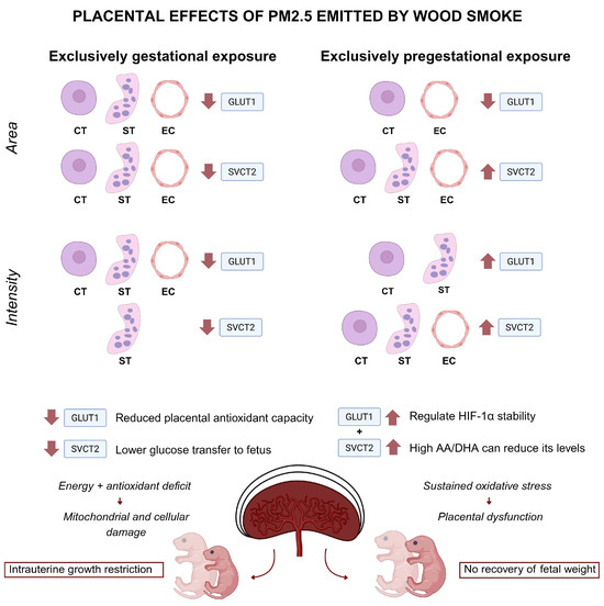 Placental effects of wood smoke-derived PM2.5 exposure on GLUT1 and SVCT2 expression in the labyrinth zone of rat placenta (n = 12 animals per group). Quantitative immunofluorescence analysis revealed differential effects of exclusive gestational versus exclusive pregestational exposure to PM2.5 on the expression area and fluorescence intensity of the glucose transporter GLUT1 and the sodium-dependent vitamin C transporter SVCT2 in cytotrophoblasts (CTs), syncytiotrophoblasts (STs), and endothelial cells (ECs). Gestational exposure was associated with reduced membrane expression and intensity of both transporters, suggesting impaired glucose transfer to the fetus and diminished placental antioxidant capacity, leading to a combined energy and redox deficit, mitochondrial and cellular damage, and increased risk of intrauterine growth restriction (IUGR). In contrast, pregestational exposure induced a compensatory increase in SVCT2 and GLUT1 expression, potentially as an adaptive response to oxidative stress, contributing to the regulation of HIF-1α stability; however, this did not result in recovery of fetal weight and was associated with persistent oxidative stress and placental dysfunction.