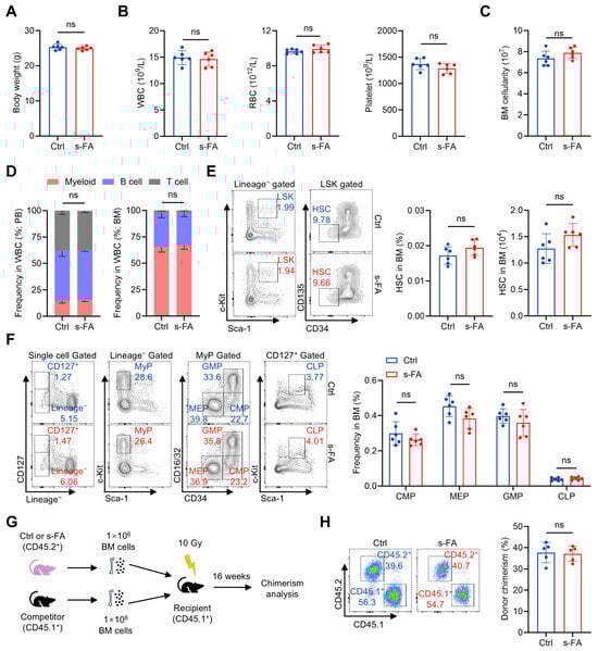 Short-term FA administration has no impact on homeostatic hematopoiesis. (A) Body weights of control (Ctrl) and s-FA-treated mice (n = 6). (B) WBC, RBC and platelet counts in PB of Ctrl and s-FA-treated mice (n = 6). (C) BM cellularity of Ctrl and s-FA-treated mice (n = 6). (D) Proportions of myeloid, B and T cells in PB and BM of Ctrl and s-FA-treated mice (n = 6). (E) Flow cytometric quantification of HSC frequency and number in the BM of Ctrl and s-FA-treated mice (n = 6). (F) Flow cytometric quantification of CMP, GMP, MEP and CLP frequencies in the BM of Ctrl and s-FA-treated mice (n = 6). (G) Scheme for competitive BM transplantation. (H) Flow cytometric quantification of donor chimerism in PB of recipient mice (n = 5). Data represent mean ± SD. ns, no significance. Two-tailed unpaired Student’s t-test.