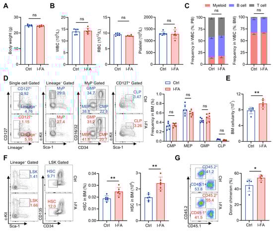 Long-term FA administration distinctively favors HSC maintenance. (A) Body weights of Ctrl and l-FA-treated mice (n = 6). (B) WBC, RBC and platelet counts in PB of Ctrl and l-FA-treated mice (n = 6). (C) Proportions of myeloid, T and B cells in PB and BM of Ctrl and l-FA-treated mice (n = 6). (D) Flow cytometric quantification of CMP, GMP, MEP and CLP frequencies in the BM of Ctrl and l-FA-treated mice (n = 6). (E) BM cellularity of Ctrl and l-FA-treated mice (n = 6). (F) Flow cytometric quantification of HSC frequency and number in the BM of Ctrl and l-FA-treated mice (n = 6). (G) Flow cytometric quantification of donor chimerism in PB of recipient mice (n = 5). Data represent mean ± SD. * p < 0.05, ** p < 0.01, ns, no significance. Two-tailed unpaired Student’s t-test.