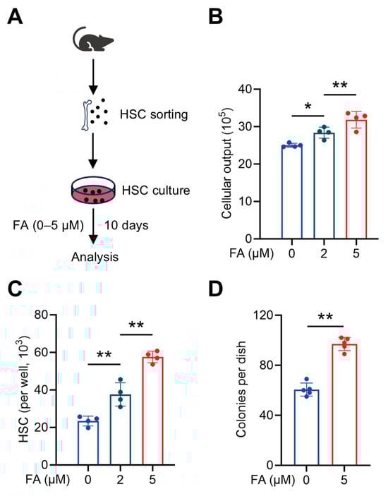 Next, we tested whether FA could directly promote HSC maintenance. To this end, we employed an established ex vivo culture system capable of maintaining HSC self-renewal and promoting functional HSC expansion [17], and supplemented the HSC culture with different concentrations of FA (Figure 3A). It was found that FA significantly boosted the cellular output of HSC culture within the concentration range of 2 to 5 μM in a dose-dependent manner (Figure 3B). Meanwhile, as did the results in vivo, FA also significantly and dose-dependently promoted the expansion of HSCs ex vivo (Figure 3C), reinforcing that the enhanced HSC maintenance underlies the boosted hematopoiesis. To further determine the maintenance of functional HSCs ex vivo, we performed a colony assay by plating HSPC-enriched Lineage− cells sorted from HSC culture into a methylcellulose medium. It was observed that more colonies were formed by Lineage− cells sorted from the HSC culture supplemented with FA (Figure 3D), confirming that functional HSCs were expanded in the presence of FA ex vivo. Thus, FA is capable of directly promoting HSC maintenance, thereby boosting hematopoiesis.