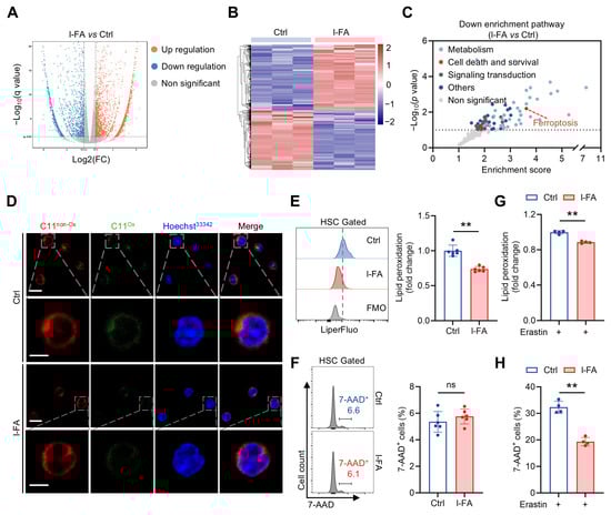 FA diminishes ferroptosis susceptibility of HSCs. (A,B) Transcriptomic profiling of BM HSCs of Ctrl and l-FA-treated mice. (C) Downregulated signaling pathways as revealed by KEGG pathway enrichment analysis in BM HSCs of l-FA-treated versus Ctrl mice. (D) Membrane lipid peroxidation as reflected by BODIPY 581/591 C11 staining in BM HSCs of Ctrl and l-FA-treated mice. Scale bar, 10 μm (upper panel). Scale bar, 5 μm (down panel). (E,F) Flow cytometric quantification of membrane lipid peroxidation (E) and cell death (F) in BM HSCs of Ctrl and l-FA-treated mice (n = 6). (G,H) Ferroptosis susceptibility analysis of BM HSCs in Ctrl and l-FA-treated mice (n = 4). Data represent mean ± SD. ** p < 0.01, ns, no significance. Two-tailed unpaired Student’s t-test.