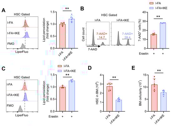 IKE administration restores ferroptosis susceptibility and maintenance of HSCs in l-FA-treated mice. (A) Flow cytometric quantification of membrane lipid peroxidation in BM HSCs of l-FA-treated mice with or without IKE administration (n = 6). (B,C) Ferroptosis susceptibility analysis of BM HSCs in l-FA-treated mice with or without IKE administration (n = 4). (D) HSC numbers in the BM of l-FA-treated mice with or without IKE administration (n = 6). (E) BM cellularity of l-FA-treated mice with or without IKE administration (n = 6). Data represent mean ± SD. ** p < 0.01. Two-tailed unpaired Student’s t-test.