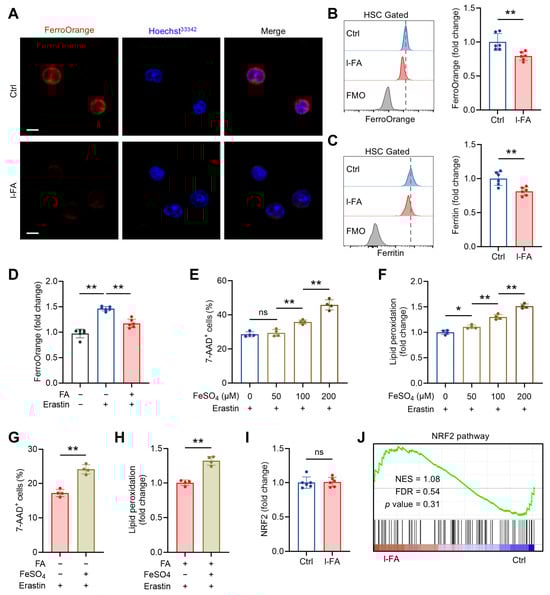 FA limits labile iron (Fe2+) pool in HSCs independently of NRF2. (A) Analysis of LIP size by FerroOrange staining in BM HSCs of Ctrl and l-FA-treated mice. Scale bar, 10 μm. (B) Flow cytometric quantification of LIP size in BM HSCs of Ctrl and l-FA-treated mice (n = 6). (C) Flow cytometric quantification of ferritin expression in BM HSCs of Ctrl and l-FA-treated mice (n = 6). (D) LIP size in HSCs cultured with FA and/or erastin (n = 6). (E,F) Ferroptosis analysis of HSCs cultured with different concentrations of FeSO4 (n = 4). (G,H) Ferroptosis analysis of HSCs cultured with FA and/or FeSO4 (n = 4). (I) Flow cytometric quantification of NRF2 expression in BM HSCs of Ctrl and l-FA-treated mice (n = 6). (J) GSEA of NRF2 pathway in BM HSCs of l-FA-treated versus Ctrl mice. Data represent mean ± SD. * p < 0.05, ** p < 0.01, ns, no significance. Two-tailed unpaired Student’s t-test unless stated otherwise. One-way ANOVA (D–F). NES, normalized enrichment score; FDR, false discovery rate.