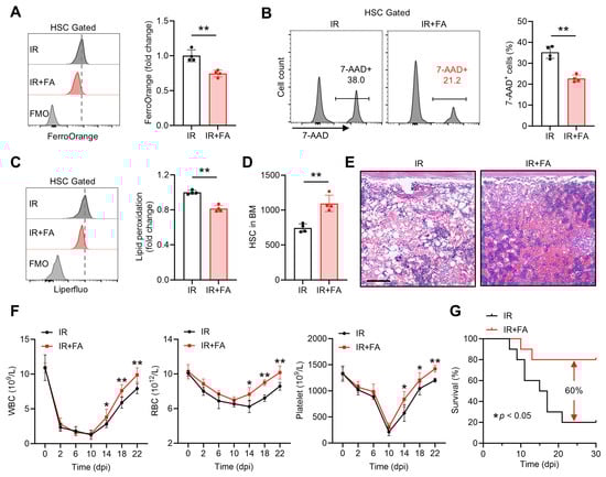 We further tested whether the LIP limitation and anti-ferroptosis activity of FA are valuable for clinical translation. Acute myelosuppressive injury, in which HSC ferroptosis is implicated, is always life-threatening and a primary cause for the discontinuation of cancer therapy [5]. We then wondered if FA treatment could mitigate HSC ferroptosis and thereby rescue acute myelosuppressive injury induced by exposure to a sublethal dose (5 Gy) of ionizing radiation (IR). Consistent with previous studies [16,18], dramatic cell death (Figure S3A) and lipid peroxidation (Figure S3B) were detected in the BM HSC compartment at 1 day post IR (dpi), when HSC ferroptosis peaks, along with markedly increased LIP size (Figure S3C). Accordingly, severely impaired HSC maintenance was observed at 1 dpi (Figure S3D), accompanied by myelosuppression as manifested by dramatic reductions in WBC, RBC and platelet counts in PB (Figure S3E). However, immediate FA supplementation remarkably alleviated Fe2+ accumulation (Figure 7A) and ferroptosis (Figure 7B,C) of HSCs at 1 dpi. Finally, the impaired HSC maintenance (Figure 7D) and myelosuppression (Figure 7E,F) induced by IR were significantly rescued by this short-term FA supplementation regimen. Moreover, FA supplementation led to a 60% increase in survival in a murine model of lethal myelosuppressive injury induced by 7.5 Gy IR (Figure 7G). Thus, FA safeguards HSC maintenance after acute myelosuppressive injury through mitigating Fe2+ overload and ferroptosis of HSCs, reinforcing the promotive action of FA in HSC maintenance.