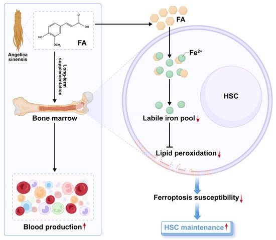 In this study, we reveal that FA, a bioactive component abundantly present in Angelica sinensis, distinctively and directly promotes HSC maintenance and thereby boosts hematopoiesis in both homeostasis and acute myelosuppressive injury (Figure 8). These findings inform that the hematopoiesis-promoting activity of Angelica sinensis is partly mediated by FA through its action on HSC maintenance. Apart from Angelica sinensis, FA is also widely present in vegetables and fruits [8]. Thus, our results may partly explain why a higher intake of vegetables and fruits, a hallmark of a healthy diet pattern, benefits HSC maintenance [32]. Overall, the findings of this study substantially improve our understanding of the beneficial effect of FA-rich herbs and diet as well as suggest FA supplementation as a promising avenue to preserve functional HSCs, whose maintenance is always compromised during physiological aging [33].