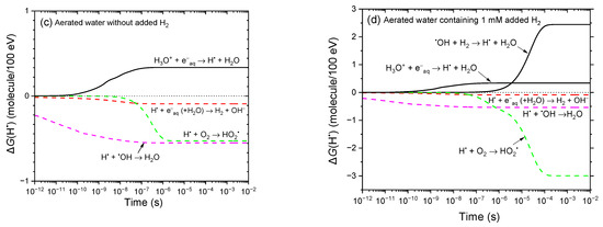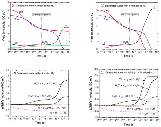 A pronounced decrease—by approximately 2.5 G-units—in G(•OH) is observed in the 1–100 μs time range in the presence of added H2 (Figure 1b), consistent with reaction (4), which highlights the strong •OH-scavenging capacity of molecular hydrogen. G(•OH) steadily declines and approaches zero by ~100 μs. In contrast, the radiolysis of deaerated water—whether or not H2 is present—leads to the formation of H• radicals. However, as shown in Figure 1a,b, G(H•) increases markedly when H2 is added, rising from ~2.8 molecules/100 eV at 10 ms (without H2) to ~5.2 molecules/100 eV with 1 mM added H2. This behavior is further illustrated in Figure 1c,d, which presents the time-dependent contributions ∆G(H•) from the individual reactions involved in the formation and decay of H• atoms, as calculated in our simulations for 300 MeV proton irradiation. In the absence of H2, the primary sources of H• are the following reactions [4,36]: