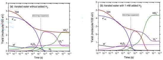 In the absence of added H2, the time evolution of G(•OH) remains essentially unchanged compared to the deaerated case. However, in the presence of 0.25 mM dissolved oxygen, H• atoms are converted into HO2• via reaction (5), which proceeds at ~0.3 μs, based on the reciprocal of oxygen’s scavenging power. Additionally, unlike in the radiolysis of deaerated water, hydrated electrons are rapidly scavenged by O2 through reaction (10), forming superoxide anion radicals at around 0.2 μs. As a result, most—if not all—e−aq are effectively converted into O2•−, accounting for the sharp rise in G(O2•−) observed between ~10 ns to 1 μs. At longer times, G(O2•−) gradually decreases due to the following reaction [4,36]: