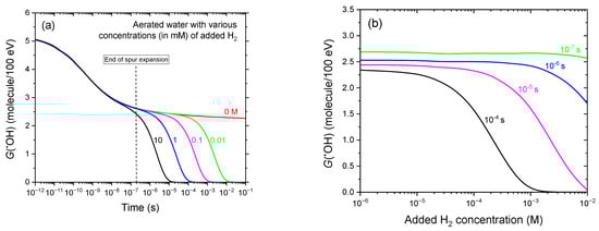 Figure 3b provides an alternative representation of Figure 3a, showing how G(•OH) decreases with increasing H2 concentration (10−3–10 mM) at post-irradiation times of 0.1, 1, 10, and 100 μs. These results underscore the concentration-dependent scavenging effect of H2 on •OH radicals, as revealed by our Monte Carlo simulations.