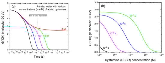 Panel (a) shows the time evolution of the yield of •OH radicals as obtained from our IONLYS-IRT Monte Carlo track chemistry simulations of the radiolysis of aerated water by 300 MeV protons (LET ~ 0.3 keV/μm) at 25 °C, over a time range from ~1 ps to 100 ms, in the presence of varying cystamine (RSSR) concentrations (in mM): 10 (black line), 1 (blue), 0.1 (magenta), and 0.01 (green). The red line shows G(•OH) in the absence of cystamine. For reference, the vertical dashed line at ~0.2 μs marks the transition from nonhomogeneous spur kinetics to homogeneous kinetics in the bulk solution [53]. Panel (b) provides an alternative view of Figure 4a, showing the decrease in G(•OH) with increasing RSSR concentration (10−3–10 mM) at post-irradiation times of 10−7, 10−6, 10−5, and 10−4 s, as obtained from our Monte Carlo simulations. The concentration of dissolved oxygen used in the simulations was 0.25 mM.