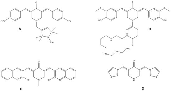 Structures of the synthetic 4-piperidone-derived cyclic C5-curcuminoids (A–D) with proven antioxidant activity or neuroprotective ability. The presence of phenolic OH groups in the molecule is not obligatory for free-radical neutralizing/antioxidant activity.