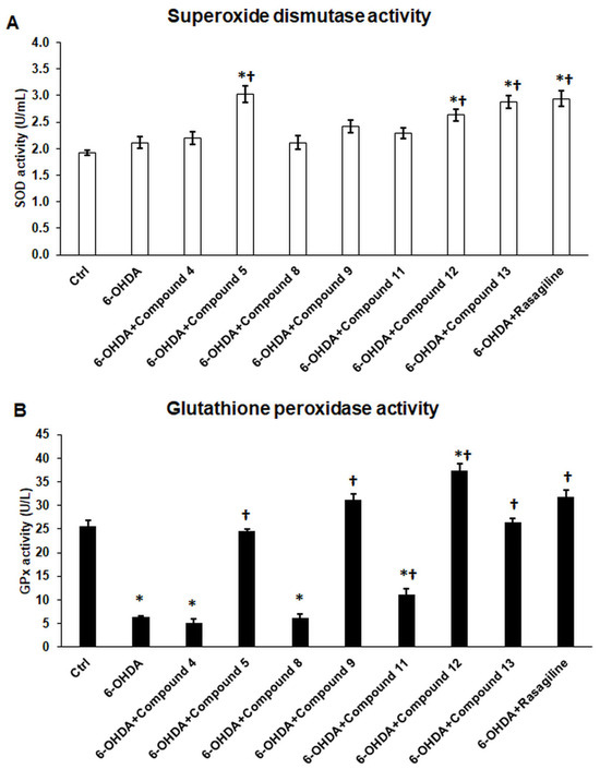 Superoxide dismutase and glutathione peroxidase activity measurements of the 6-OHDA-induced differentiated SH-SY5Y cells. SOD activity was measured using the Superoxide Dismutase Activity Assay Kit. GPx activity was determined using the Glutathione Peroxidase Assay Kit. (A) SOD activity in 6-OHDA-induced differentiated SH-SY5Y cells after treatment with the sample compounds and rasagiline. (B) GPx activity in 6-OHDA-induced differentiated SH-SY5Y cells after treatment with the sample compounds and rasagiline. Each column shows the mean ± SD derived from three independent experiments (n = 3). The * signifies a p-value of less than 0.05 in comparison to the control. The † indicates p < 0.05, compared with the 6-OHDA treatment. Abbreviations: 6-OHDA, 6-hydroxydopamine; GPx, glutathione peroxidase; SOD, superoxide dismutase.