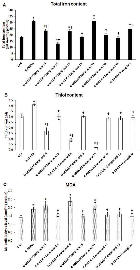 Total intracellular iron content and thiol concentrations and MDA levels in 6-OHDA-induced differentiated SH-SY5Y cells. The total intracellular iron content was determined using a colorimetric ferrozine-based assay. The total intracellular thiol levels were measured using a Thiol Assay. (A) Total iron content of 6-OHDA-induced differentiated SH-SY5Y cells after treatment with the sample compounds and rasagiline. (B) Thiol levels in 6-OHDA-induced differentiated SH-SY5Y cells after treatment with sample compounds and rasagiline. (C) MDA levels in 6-OHDA-induced differentiated SH-SY5Y cells after treatment with sample compounds and rasagiline. Each column shows the mean ± SD derived from three independent experiments (n = 3). The * signifies a p-value of less than 0.05 in comparison to the control. The † indicates p < 0.05, compared with the 6-OHDA treatment. Abbreviations: 6-OHDA, 6-hydroxydopamine.