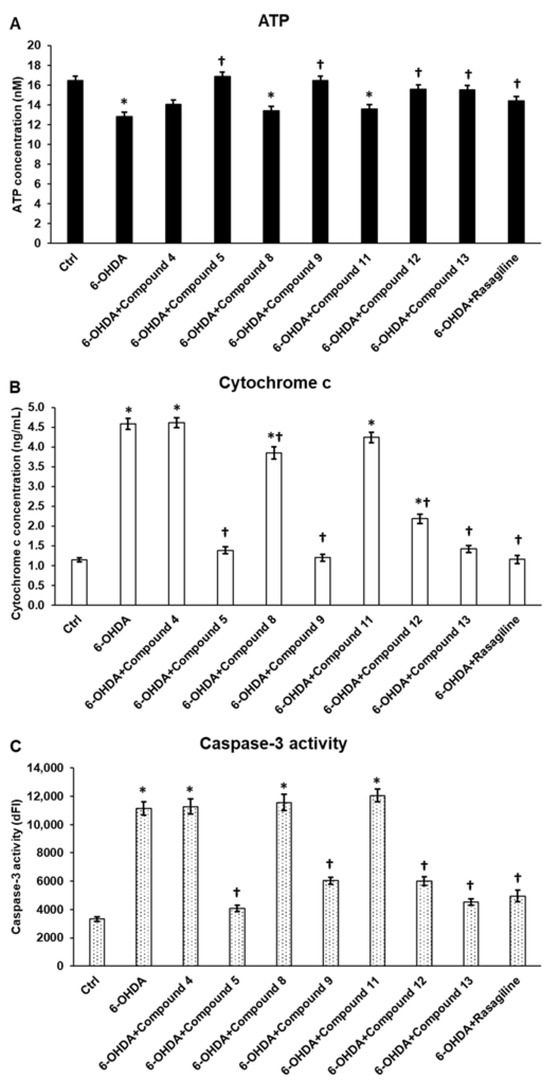 Increased ROS production may lead to mitochondrial dysfunction, reduced energy production, the release of cytochrome c, and the activation of caspase-3, an effector caspase, leading to apoptosis. The 6-OHDA treatment of differentiated SH-SY5Y cells significantly reduced ATP levels, increased cytochrome c release, and enhanced apoptosis (Figure 6A,B). Compounds 5, 9, 12, and 13 restored energy production to the control level (Figure 6A). In parallel with these findings, the aforementioned compounds significantly decreased cytochrome c concentration and caspase-3 activation (Figure 6A–C). Compound 5 was proven to act the most effectively in the in vitro 6-OHDA-induced neuronal damage model. The effect of rasagiline was similar to that of compounds 5 and 13 (Figure 6). The observed change in the case of compounds 4, 8 and 11 may not reflect the negative effects of the compounds on mitochondrial function, but rather the influence of 6-OHDA, as there was no significant difference between the 6-OHDA treatment and the 6-OHDA combined with compounds 4, 8, and 11.