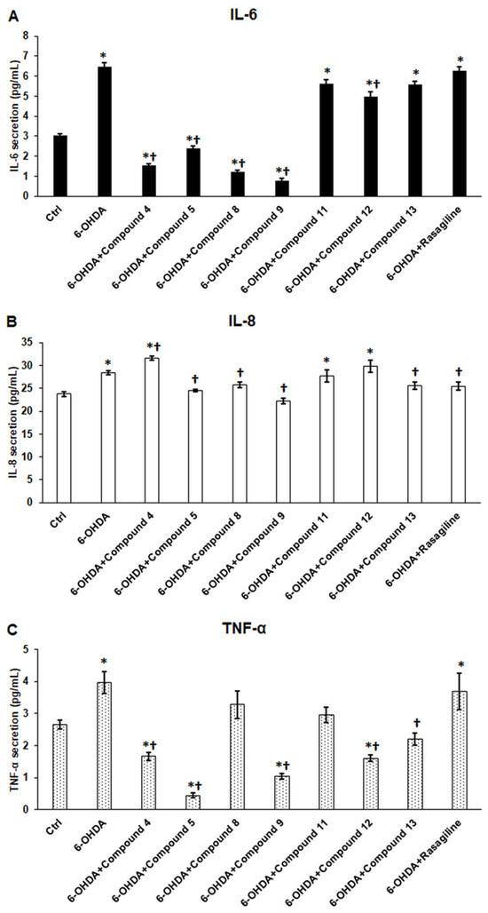 IL-4 and IL-10 release from 6-OHDA-induced differentiated SH-SY5Y cells. The concentrations of secreted IL-4 and IL-10 from the cell culture supernatants were determined using human IL-4 and IL-10 ELISA Kits. (A) IL-4 levels in 6-OHDA-induced differentiated SH-SY5Y cells after treatment with the test compounds and rasagiline. (B) IL-10 release in 6-OHDA-induced differentiated SH-SY5Y cells after treatment with sample compounds and rasagiline. Each column shows the mean ± SD derived from three independent experiments (n = 3). The * signifies a p-value of less than 0.05 in comparison to the control. The † indicates p < 0.05, compared with the 6-OHDA treatment. Abbreviations: 6-OHDA, 6-hydroxydopamine.