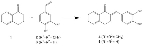 2E-(3′,4′-Dimethoxybenzylidene)-1-tetralone (4) was prepared according to a previously described method for the preparation of 2-(3′,4′-methylenedioxybenzylidene)-1-tetralone in [32], starting from 1,2-dimethoxybenzaldehyde (2) and α-tetralone (1).