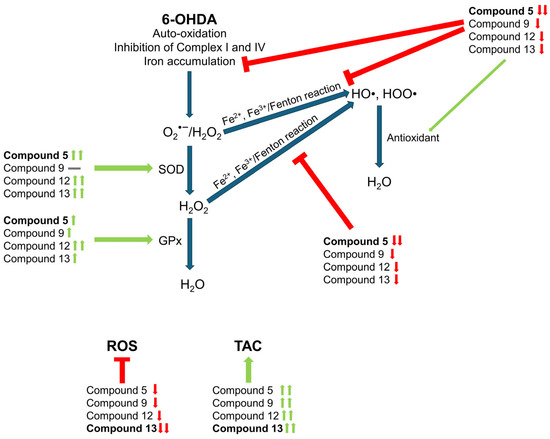 3.5. Cyclic C5-Curcuminoids 9, 12, 13 and Cyclic Chalcone 5 Inhibit 6-OHDA-Induced Iron Accumulation and Lipid Peroxidation