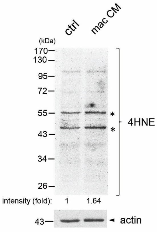 Since macrophages are one of the major sources of oxidative stress via producing reactive oxygen species (ROS) during inflammation and in response to pathogens, we then treated human normal prostate epithelial cells PZ-HPV7 with or without macrophage Raw264.7 cell-derived conditioned media for 48 h and used this conditioned-media treatment as a positive control for 4HNE evaluation via immunoblots. As shown in Figure 1, there were several bands ranging from different molecular weights detected as formed 4HNE protein adducts in PZ-HPV7 normal prostate epithelial cells. Furthermore, when treating with the macrophage-conditioned media, two 4HNE-formed protein adducts with a molecular weight of around 55 and 45 kDa were elevated. This indicated 4HNE protein adduct formation detected by 4HNE immunoblotting can be used as a readout for oxidative stress and a general production of reactive oxygen species (ROS).