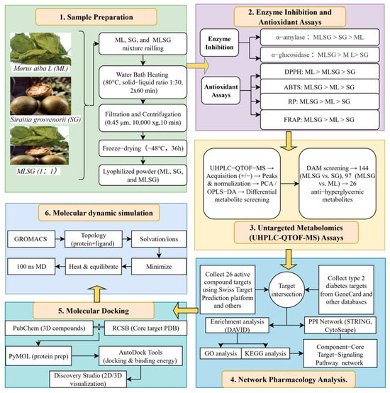 Here, we integrate enzyme inhibition, antioxidant assays, UHPLC-QTOF-MS metabolomics, network pharmacology, and molecular docking to ① compare mulberry leaf–Siraitia grosvenorii lyophilized powder (MLSG) vs. individual components for enzyme inhibition and antioxidant activity; ② screen and identify clusters of bioactive compounds with anti-T2DM potential; ③ elucidate the molecular basis underlying MLSG’s multi-target synergistic regulation of T2DM (Figure 1). Finally, a mechanistic foundation and design framework will be established to guide the development of evidence-based functional foods or natural therapeutics targeting the pathogenesis of T2DM.
