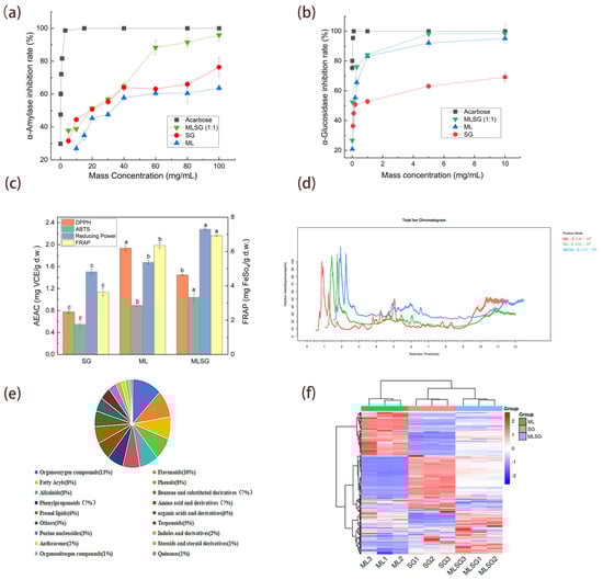 Enzyme inhibition, antioxidant capacity, and metabolic profiling of ML, SG, and MLSG. (a,b) Inhibition of α-amylase (a) and α-glucosidase (b) using ML, SG, MLSG, and acarbose (positive control) across a concentration range (mg/mL). (c) Antioxidant activities assessed using DPPH, ABTS+, reducing power, and FRAP assays, expressed as vitamin C equivalents (VCE, mg/g dry weight) or FeSO4 equivalents (mg/g dry weight). Different letters indicate significant differences (p < 0.05). (d) Representative total ion chromatograms (TICs) for ML, SG, and MLSG in positive ion modes. (e) Proportional distribution of identified metabolites among chemical categories. (f) Hierarchical clustering heatmap of differential metabolites (log2 fold change > 1, p < 0.05); red indicates higher and blue lower relative abundance.