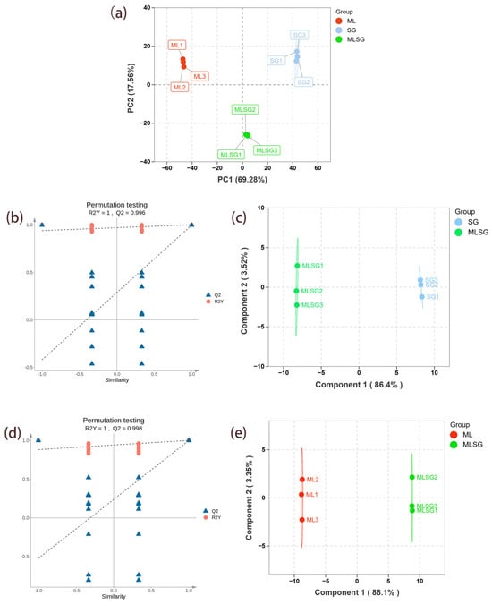 Multivariate statistical analysis of LC–MS metabolomic. (a) PCA score plot showing separation among Morus alba (ML), Siraitia grosvenorii (SG), and their combination (MLSG). (b) Permutation test validating the OPLS-DA model for MLSG vs. ML. (c) OPLS-DA score plot for MLSG vs. ML. (d) Permutation test validating the OPLS-DA model for MLSG vs. SG. (e) OPLS-DA score plot for MLSG vs. SG.