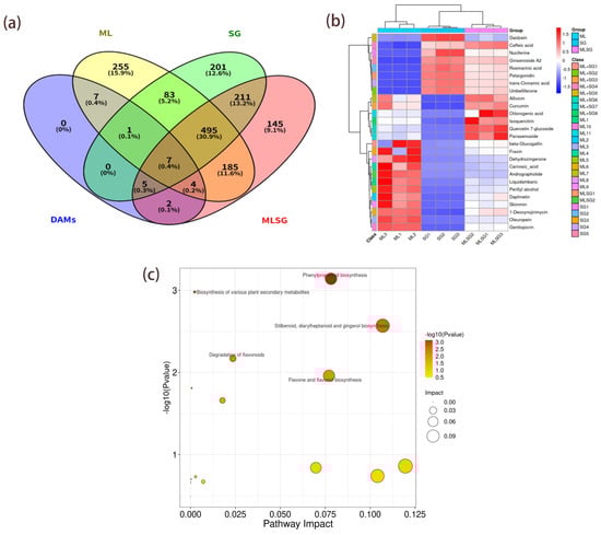 Comparative analysis of anti-diabetic differentially abundant metabolites (DAMs) from ML, SG, and MLSG. (a) Venn diagram showing the distribution of 26 bioactive DAMs with reported anti-hyperglycemic potential, classified into ML-specific, SG-specific, shared, and MLSG-unique metabolites. (b) Hierarchical clustering heatmap of the 26 DAMs, illustrating distinct metabolic profiles between MLSG and the individual extracts. (c) KEGG pathway enrichment of the 26 DAMs, highlighting predominant involvement in phenylpropanoid biosynthesis, flavonoid/flavone biosynthesis, and terpenoid pathways.