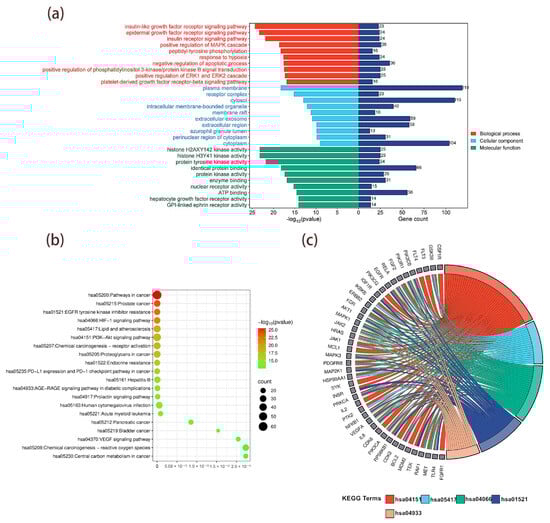 Functional enrichment analysis of common MLSG–T2DM targets. (a) GO enrichment analysis of 213 common targets shared between T2DM and MLSG, categorized into biological processes (red), cellular components (blue), and molecular functions (green), with the top 10 terms from each category ranked by significance (p < 0.05). (b) KEGG pathway enrichment bubble plot showing the top 20 significantly enriched pathways ranked by p-value, with bubble size representing the number of enriched genes and color scale indicating significance. (c) KEGG critical pathway–target network highlighting the top five pathways most closely associated with T2DM pathogenesis: PI3K–Akt signaling (hsa04151), lipid and atherosclerosis (hsa05417), HIF-1 signaling (hsa04066), EGFR tyrosine kinase inhibitor resistance (hsa01521), and AGE–RAGE signaling in diabetic complications (hsa04933), mapped to their associated targets.