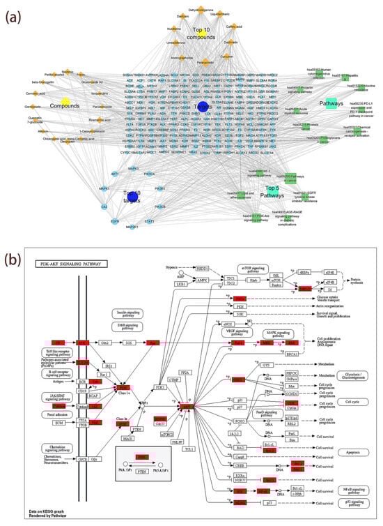 “Component–core target–signaling pathway” network analysis of MLSG against T2DM. (a) Network diagram linking 26 key bioactive compounds (orange diamonds) to 213 predicted protein targets (blue circles) and 15 KEGG-enriched pathways (green squares). Node size reflects degree value, with larger nodes indicating higher connectivity and stronger correlations; (b) KEGG PI3K–Akt signaling pathway map highlighting key MLSG-regulated targets (red), illustrating potential multi-target modulation relevant to T2DM pathogenesis.