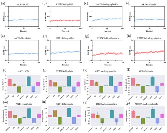 RMSD analysis of protein–ligand complexes over 100 ns simulation (a–h), and the total energy analysis of the protein–ligand complexes in MD (i–p). (a,i) AKT1-SC79, (b,j) PIK3CA-alpelisib, (c,k) AKT1-andrographolide, (d,l) AKT1-daidzein, (e,m) AKT1-nuciferine, (f,n) AKT1-pelargonidin, (g,o) PIK3CA-liquidambaric acid, and (h,p) PIK3CA-andrographolide complexes.