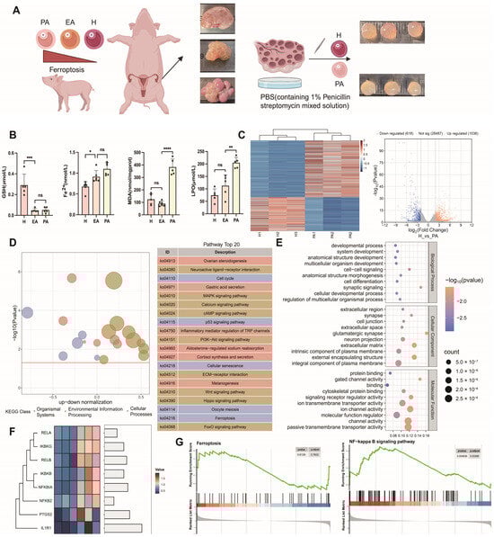 Transcriptome sequencing analysis of healthy and atretic follicles. (A) Healthy follicles (H), primary atretic follicle (EA), and atretic follicles (PA) were collected from different ovaries of pigs for transcriptome sequencing. In the schematic diagram of ovarian tissue, arrows indicate follicles, red arrows: healthy follicles, black arrows: atretic follicles. (B) Differences in the content of ferroptosis markers among healthy follicles, primary atresia follicles, and atresia follicles. (C) Volcanic and heat maps of differential genes in healthy follicles and atretic follicles. (D) Differential gene GO enrichment analysis of healthy follicles and atretic follicles. (E) Differential gene KEGG enrichment analysis of healthy follicles and atretic follicles. (F) Differential expression of NF-κB/PTGS2-related genes by transcriptome sequencing. (G) NF-κB and KEGG gene set enrichment analysis of the ferroptosis pathway. Significance: *, p < 0.05; **, p < 0.01; ***, p < 0.001; ****, p < 0.0001.