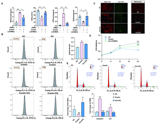 Blocking the nuclear import of NF-κB can rescue the effect of ferroptosis on primary porcine ovarian granulosa cells. (A) Ferroptosis markers after NC, erastin, erastin + -(-) DHMEQ treatment. (B) The ratio of lipid peroxidation after NC, erastin, erastin + -(-) DHMEQ treatment on ovarian granulosa cells. (C) JC-1 was used to detect the changes in mitochondrial membrane potential after NC, erastin, and erastin + -(-) DHMEQ treatment. MitoTracker activity after NC, erastin, erastin + -(-) DHMEQ treatment. (D) CCK-8 was used to detect the effects of NC, erastin, and erastin + -(-) DHMEQ on the proliferation of ovarian granulosa cells. (E) qRT-PCR was used to detect the effects of NC, erastin, erastin + -(-) DHMEQ treatment on Bcl2/BAX regulatory axis and apoptosis marker genes in ovarian granulosa cells. NC, erastin, erastin + -(-) DHMEQ after processing by flow cytometry to detect cell proliferation cycle. Significance: *, p < 0.05; **, p < 0.01; ***, p < 0.001; ****, p < 0.0001.