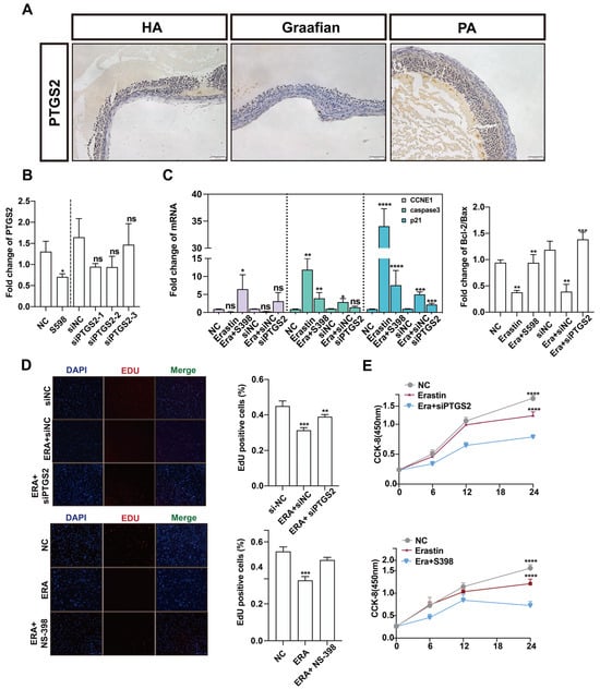 The effect of PTGS2 inhibition on the proliferation of primary porcine ovarian granulosa cells. (A) The expression of PTGS2 in healthy follicles (HA), mature follicles (Graafian follicle), and atretic follicles (PA) was detected by immunohistochemistry (200 um ruler in the lower right corner). (B) qRT-PCR was used to detect the inhibition efficiency of the PTGS2 gene by NC, NS-398, and siPTGS2 treatment. (C) qRT-PCR was used to detect the effects of NC, erastin + NS-398, and erastin + siPTGS2 on the Bcl2/BAX regulatory axis, cell proliferation, and apoptosis marker genes in ovarian granulosa cells. Ovarian granulosa cells were treated. (D) EDU immunofluorescence observation added staining pictures of the E group, E + NS398 group, siNC group, E + siNC group, E + siPTGS2 group, and the control group. (E) The results of the cck assay at 6 h, 12 h, 18 h, and 24 h of cells added to the E group, E + siPTGS2 group, E + NS398 group, and the control group. Significance: *, p < 0.05; **, p < 0.01; ***, p < 0.001; ****, p < 0.0001.