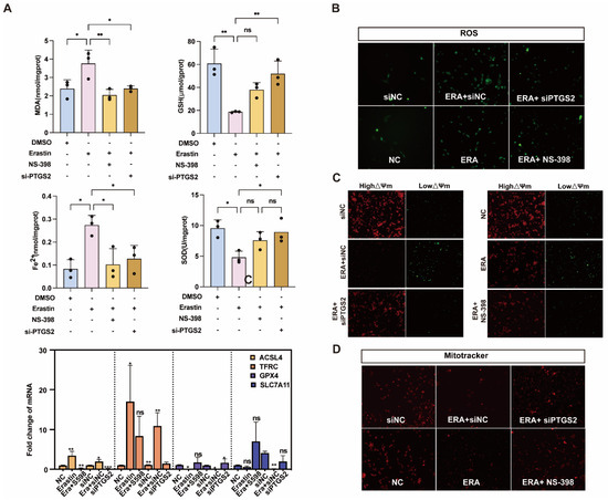 Inhibition of PTGS2 expression rescued ferroptosis and mitochondrial damage in primary porcine granulosa cells. (A) Detection of ferroptosis markers in ovarian granulosa cells treated with NC, erastin + NS-398, and erastin + siPTGS2. qRT-PCR was used to detect the inhibition efficiency of NC, erastin, erastin + NS-398, and erastin + siPTGS2 in ferroptosis marker genes. (B) The levels of reactive oxygen species (ROS) in ovarian granulosa cells treated with NC, erastin + NS-398, and erastin + siPTGS2 were detected. (C) The mitochondrial activity of ovarian granulosa cells treated with NC, erastin + NS-398, and erastin + siPTGS2 was detected by MitoTracker. (D) The mitochondrial membrane potential of ovarian granulosa cells was detected by NC, erastin + NS-398, and erastin + siPTGS2 treatment. Significance: *, p < 0.05; **, p < 0.01; ***, p < 0.001.