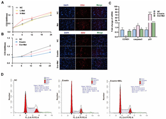 Melatonin rescues the inhibitory effect of ferroptosis on the proliferation of primary porcine ovarian granulosa cells. (A) CCK-8 was used to detect the effect of different concentrations of melatonin on the proliferation of ovarian granulosa cells. The effect of high concentration of Mel on the proliferation of ovarian granulosa cells was detected by EdU. (B) CCK-8 and EdU were used to detect the proliferation ability of NC, erastin, and erastin + Mel groups. (C) The effects of NC, erastin, and erastin + Mel on cell cycle and apoptosis marker genes were detected by qRT-PCR. (D) The effects of NC, erastin, and erastin + Mel on the cell cycle were detected by flow cytometry. Significance: *, p < 0.05; **, p < 0.01; ****, p < 0.0001.