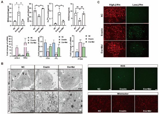 Melatonin rescued ferroptosis and mitochondrial damage in primary porcine ovarian granulosa cells. (A) The content of ferroptosis markers in NC, erastin, and erastin + Mel groups was detected. (B) The effects of NC, erastin, and erastin + Mel on ferroptosis were detected by transmission electron microscopy. (C) The changes in mitochondrial membrane potential in ovarian granulosa cells treated with NC, erastin, and erastin + Mel were detected by MitoTracker. Effects of NC, erastin, and erastin + Mel on ROS in ovarian granulosa cells. MitoTracker staining was used to detect the mitochondrial activity of ovarian granulosa cells treated with NC, erastin, and erastin + Mel. Significance: *, p < 0.05; **, p < 0.01; ***, p < 0.001.
