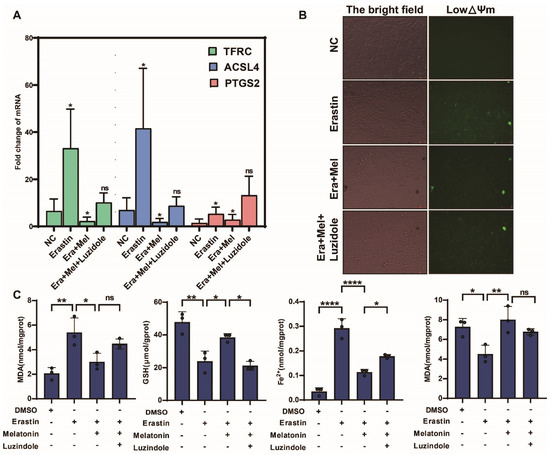 Melatonin receptor inhibitors weaken the ferroptosis-inhibiting effect of melatonin in GCs. (A) Detection of ferroptosis marker genes in ovarian granulosa cells treated with NC, erastin, erastin + Mel, and erastin + Mel + luzidole by qRT-PCR. (B) Detection of mitochondrial membrane potential changes in ovarian granulosa cells treated with NC, erastin, erastin + Mel, and erastin + Mel + luzidole. (C) was used to detect the changes in ferroptosis markers in ovarian granulosa cells treated with NC, erastin, erastin + Mel, and erastin + Mel + luzidole. Significance: *, p < 0.05; **, p < 0.01; ****, p < 0.0001.