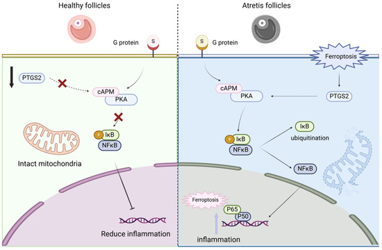 This study explored the mechanism of cell apoptosis caused by ferroptosis between healthy follicles and atretic follicles. We activated cell ferroptosis by using erastin, a ferroptosis agonist, and then used the antioxidant melatonin to antagonize the cell function damage caused by the ferroptosis agonist and verify the NF-κB/PTGS2 regulatory pathway. We found that there were differences in the degree of ferroptosis between healthy follicles and atretic follicles, and the differential genes were mainly enriched in pathways such as cell cycle, amino acid metabolism, inflammatory response, and cysteine metabolism; by using erastin to induce ovarian granulosa cell death, we found that erastin-induced cell death played a role by activating the NF-κB/PTGS2 regulatory axis, and the use of NF-κB nuclear entry inhibitors could rescue the ferroptosis effect of erastin on cells; adding melatonin could inhibit the NF-κB/PTGS2 regulatory axis, thereby inhibiting the expression of downstream inflammatory factors and ferroptosis marker genes, and protecting ovarian granulosa cells (Figure 9). This work establishes ferroptosis as a pivotal mechanism in granulosa cell death and identifies melatonin as a potent therapeutic agent that rescues GCs by disrupting the NF-κB/PTGS2 pathway. These insights offer novel strategies to combat follicular atresia, with significant implications for improving ovarian function and reproductive outcomes in agriculture and medicine.