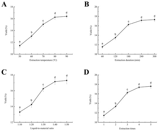 | Runs | A: Extraction Temperature (°C) | B: Extraction Duration (min) | C: Liquid-to-Material Ratio (g/mL) | D: Extraction Times | Polysaccharide Yield (%) |