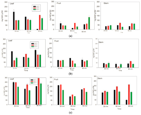 Phenolic contents of the leaves, fruits, and stems of Lysiloma divaricata at three temperatures (40 °C, 50 °C and 60 °C), three times (30 min, 60 min, 90 min), and three solvents: (a) water, (b) ethanol/water (30:70 % v/v), and (c) methanol/water (30:70 % v/v).