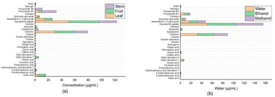 In addition, gallic acid is one of the six main compounds present in all extracts, besides which has health benefits [12]. These six compounds besides gallic acid are vanillic acid, caffeic acid, quinic acid, chlorogenic acid, and procyanidin B2; these compounds are present in all three fractions, with differences in vanillic acid, which is present only in the branches; caffeic acid, which is not found in the leaves; quinic acid, which is not found in the fruits; chlorogenic acid, which is found only in the stems; ellagic acid, which is found only in the fruits; and procyanidin B2, which is found only in the stems. From these results and those obtained by means of a spectrophotometer and according to the literature, which reports that a large number and variety of phytochemical compounds are present in the leaves, leaf samples were taken to compare the influence of the different solvents used in this work, which revealed that the compounds previously identified in the comparison of the different fractions were preserved; however, the proportions present in each of the extracts changed according to the solvent used, and the results are shown in Figure 3b and Table 2.