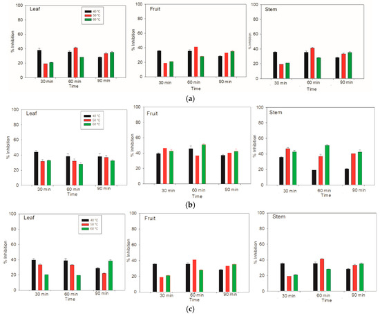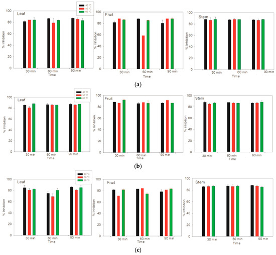 In the case of the ethanolic extracts of the leaves at 40 °C, the percentage inhibition was very similar. However, for the fruit, the ethanolic extraction time of 60 min was superior to that of the other times. For the stem, the greatest inhibition at 40 °C occurred at 30 min. On the other hand, the leaf at 50 °C had a similar percentage of inhibition three times. However, in the fruit, the greatest inhibition was reached at 30 min. The inhibition was the same for the 60 and 90 min durations. This behavior was very similar to that of the stem component, with the greatest inhibition of the radical for the fruit and stem occurring at 60 °C for 60 min.