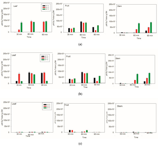 For the aqueous extraction by the DPPH method, the greatest inhibition of the whole system was achieved in the stem and fruit components at 50 °C and 40 °C for 90 min and 60 min, respectively, resulting in an inhibition of over 43% (Figure 5). On the other hand, for the leaf component, the highest inhibition of 41% was achieved at 40 °C for 30 min. Therefore, the stem and fruit compounds have a relatively high affinity for inhibiting the DPPH radical.