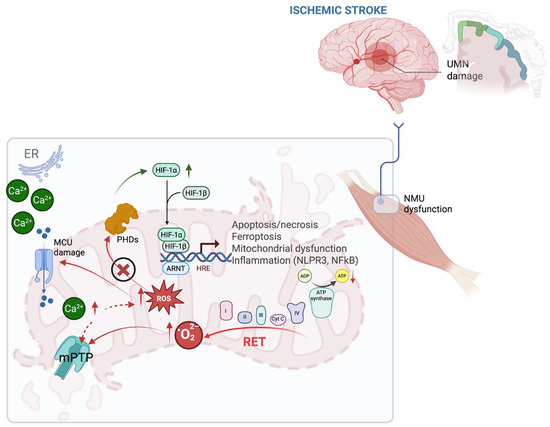 Figure 1. Oxidative stress as a key barrier to functional recovery after ischemic stroke. Brain mirror events: (i) hypoxia triggers mitochondrial dysfunction and activates HIF 1 alpha signalling pathways that act both protectively and through excessive increased ROS production (ROS induced mitochondrial damage); (ii) due to increased calcium ions in cytosol and excess of ROS, motor neurons suffer Ca2+-induced mitochondrial damage, disrupting neuromuscular signalling that contributes to contractile dysfunction, fatigue, and atrophy. Abbreviations: ARNT: aryl hydrocarbon receptor nuclear translocator; ATP: adenosine triphosphate; CoQ: coenzyme Q; Cy c: cytochrome c; ETC: electron transport chain; ER: endoplasmic reticulum; HIF-1α/β: hypoxia-inducible factor 1 alpha/beta; HRE: hypoxia response element; MCU: mitochondrial calcium uniporter; mPTP: mitochondrial permeability transition pore; NF-κB: nuclear factor κB; NMU: neuromotor unit; PHDs: HIF prolyl hydroxylases; RET: reverse electron transport; ROS: reactive oxygen species; UMN: upper motor neuron. (Created in BioRender. b, a. (2025) https://BioRender.com/8rjylth (accessed on 7 July 2025)).