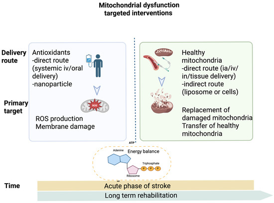 An important challenge in post-stroke recovery is the excess production of ROS, mitochondrial damage, and the consequent energy failure. Over the last decade, numerous compounds such as vitamins, polyphenols, and more specific mitochondria-targeted agents (see Table 1) have been investigated as a strategy to reduce oxidative stress and stabilise the mitochondrial membrane. However, both general and targeted antioxidants have shown only partial efficacy in restoring mitochondrial bioenergetics, which may explain the limited success of their clinical translation. This suggests that more effective strategies must extend beyond ROS scavenging and membrane stabilisation. Approaches such as enhancing mitochondrial biogenesis, metabolic reprogramming, or even mitochondrial transplantation may provide a more robust restoration of mitochondrial function and improve cellular energy balance [55,76].